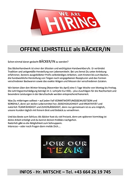 Ab sofort nehmen wir in unserer Bäckerei wieder einen Lehrling (m/w/d) auf!Nähere Infos ... siehe